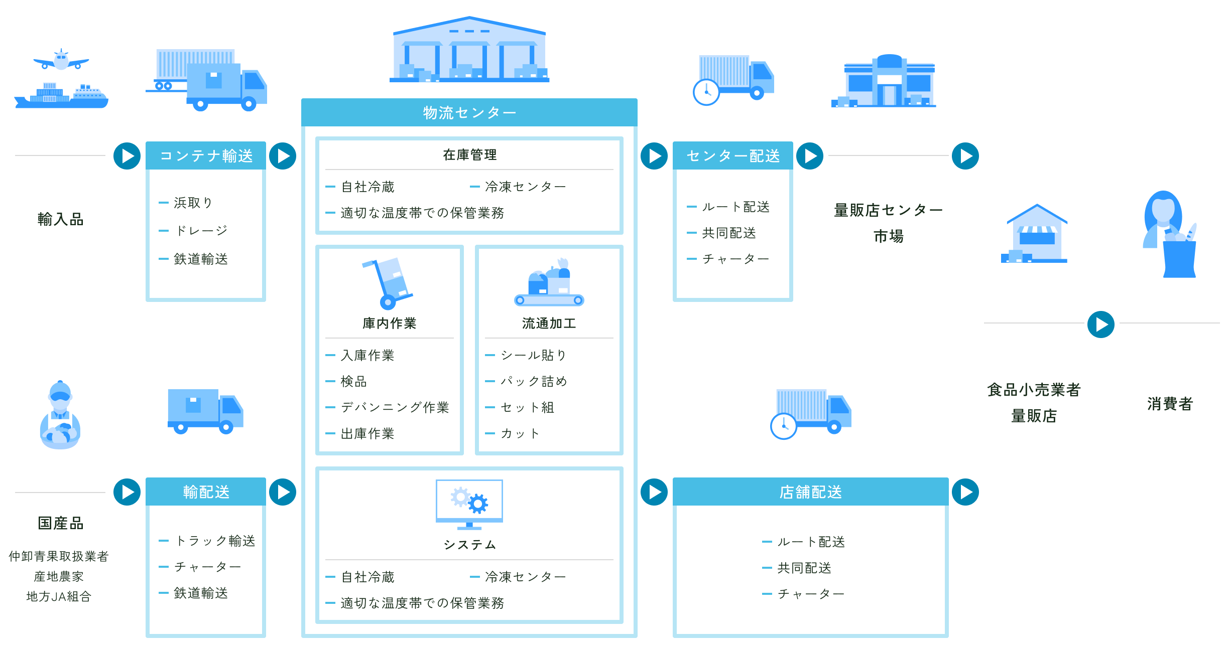 マネジメント) 事業青果に特化したコールドチェーンプラットフォームを構築し、輸入品・国産品を問わず、低温環境を維持した輸配送機能を提供しています。温度管理が必要な商品の品質を守るために、チルドセンターを保有し追熟室も完備。さらに流通加工の運営も行い、高品質な物流を実現しています。これらの物流機能は、青果に特化した自社開発のWMSやTMSで一貫管理されており、効率的かつ信頼性の高いサービスの提供が可能です。